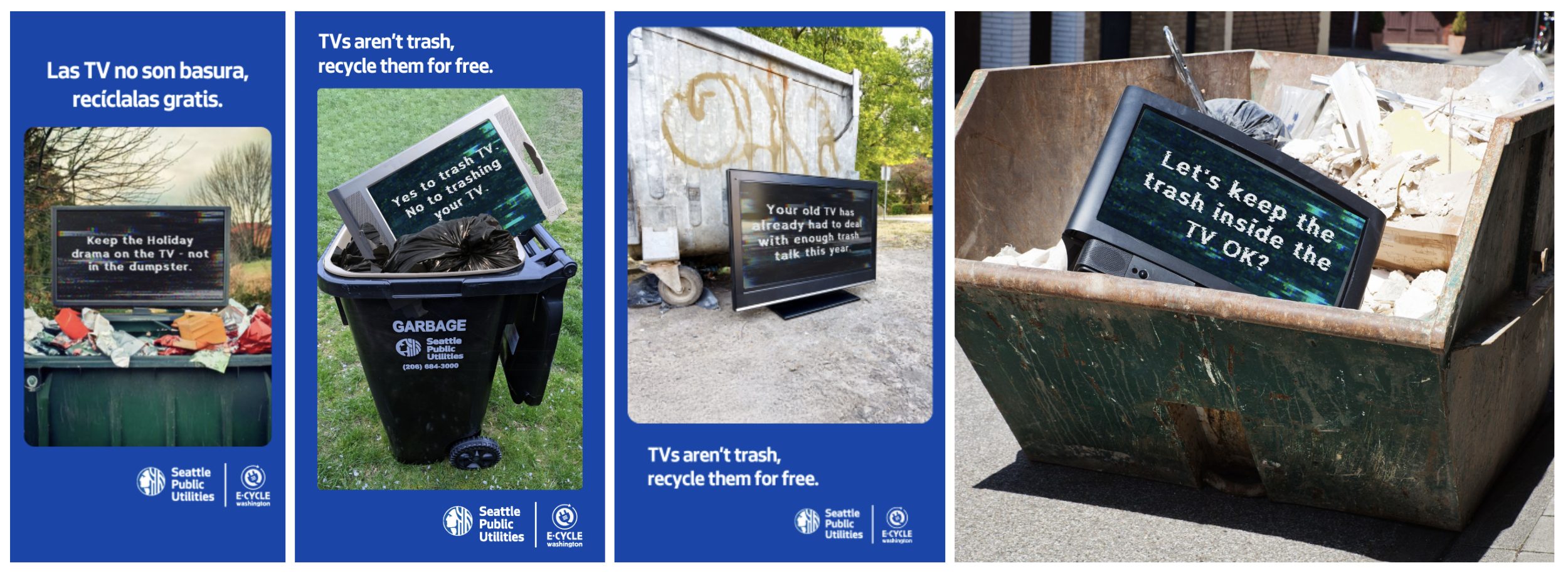 Our integrated team got to work understanding what we were up against, and what residents understood about the current program and the ban. Our strategy aimed to not shame residents, but invite them in on the progress the city was making and have a little laugh in the process. We knew the alternative was dumping or piling up old TV’s in garages. The campaign “There’s already enough trash on TV” delivered an integrated digital campaign in multiple languages and content types.